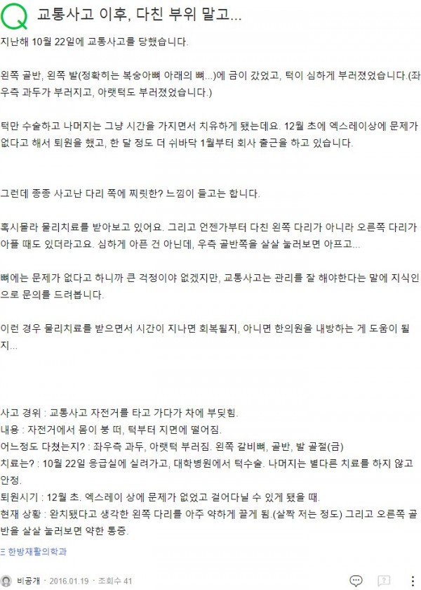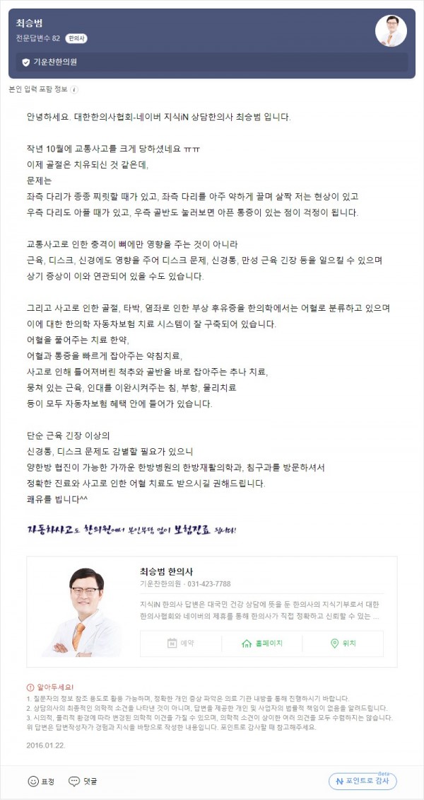 Q. 교통사고 이후, 다친 부위 말고... 페이지 정보 작성자 기운찬한의원 작성일23-09-07 16:09 조회1,651회 댓글0건 관련링크 이전글 다음글 목록 본문 [최승범 원장님의 네이버 지식in 답변입니다] 댓글목록 등록된 댓글이 없습니다. 이전글 다음글 목록