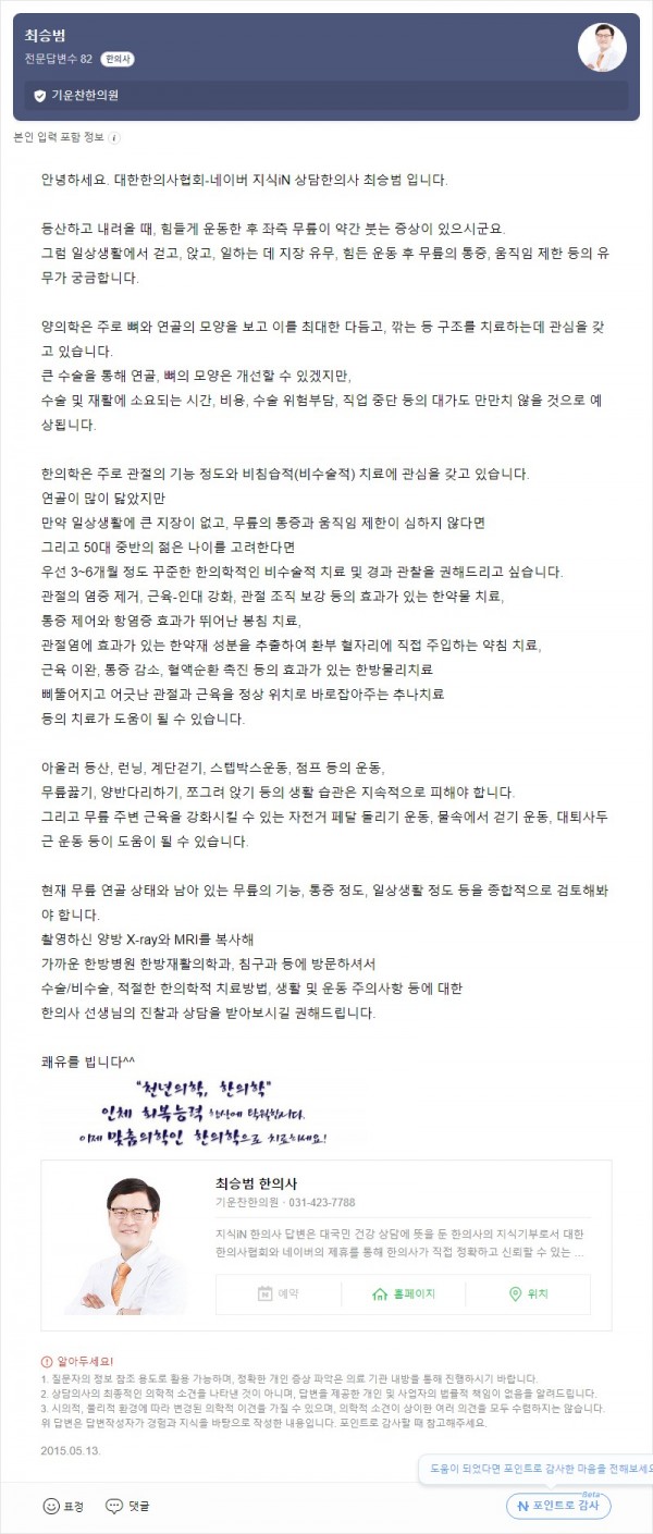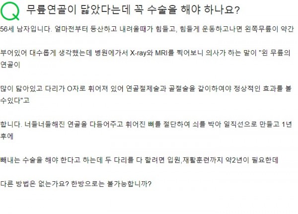 Q. 무릎연골이 닳았다는데 꼭 수술을 해야 하나요? 페이지 정보 작성자 기운찬한의원 작성일23-08-31 12:44 조회1,516회 댓글0건 관련링크 이전글 다음글 목록 본문 [최승범 원장님의 네이버 지식in 답변입니다] 댓글목록 등록된 댓글이 없습니다. 이전글 다음글 목록