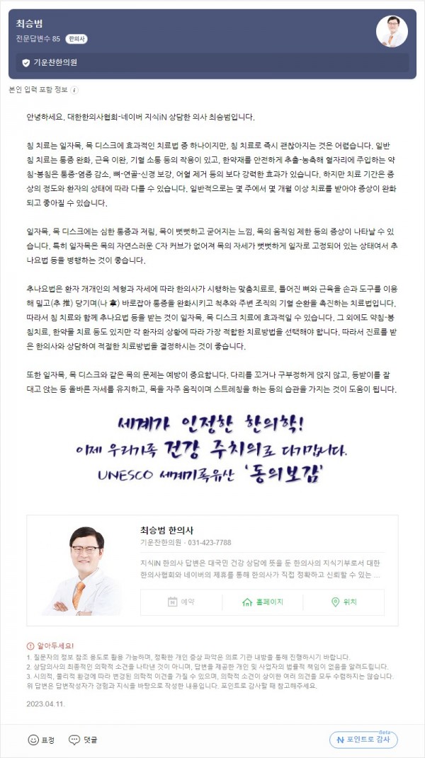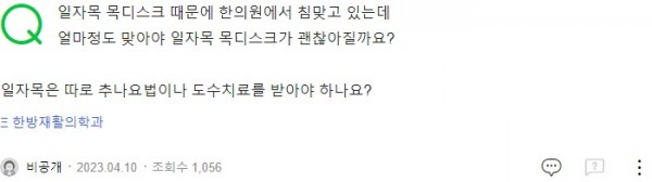 Q. 일자목 목디스크 때문에 한의원에서 침맞고 있는데 얼마정도 맞아야 일자목 목디스크가 괜찮아질까요? 페이지 정보 작성자 기운찬한의원 작성일23-09-14 15:54 조회1,729회 댓글0건 관련링크 이전글 다음글 목록 본문 [최승범 원장님의 네이버 지식in 답변입니다] 댓글목록 등록된 댓글이 없습니다. 이전글 다음글 목록