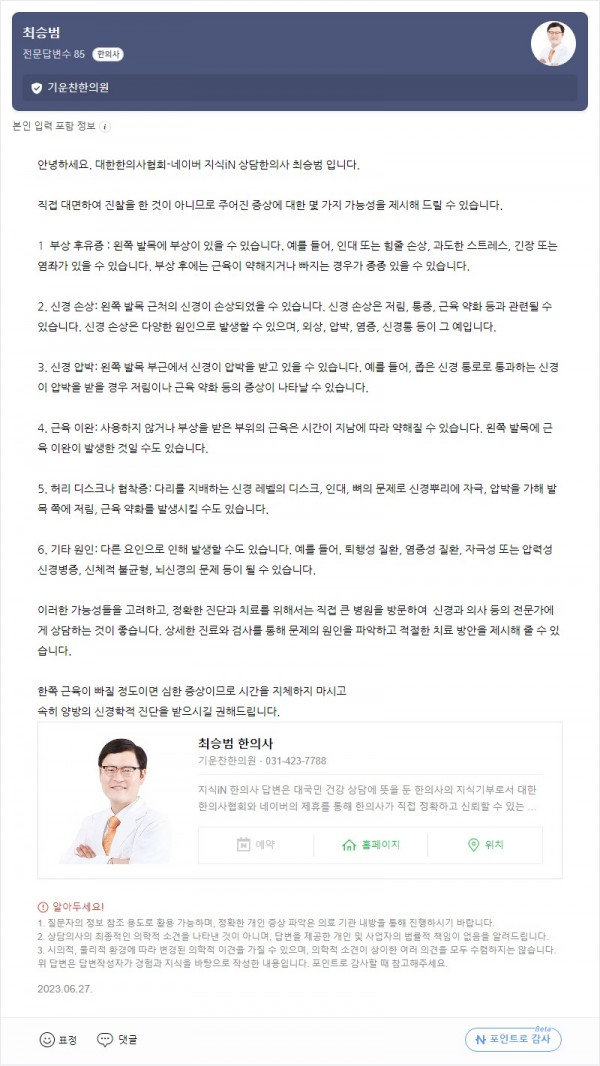 Q. 왼쪽 발목이 한 달 넘게 저리고 왼쪽 발목이 오른쪽 발목에 비해 근육도 점점 빠지는 거 같은데 왜 그러는 걸까요 페이지 정보 작성자 기운찬한의원 작성일23-09-15 09:49 조회1,650회 댓글0건 관련링크 이전글 다음글 목록 본문 [최승범 원장님의 네이버 지식in 답변입니다] 댓글목록 등록된 댓글이 없습니다. 이전글 다음글 목록